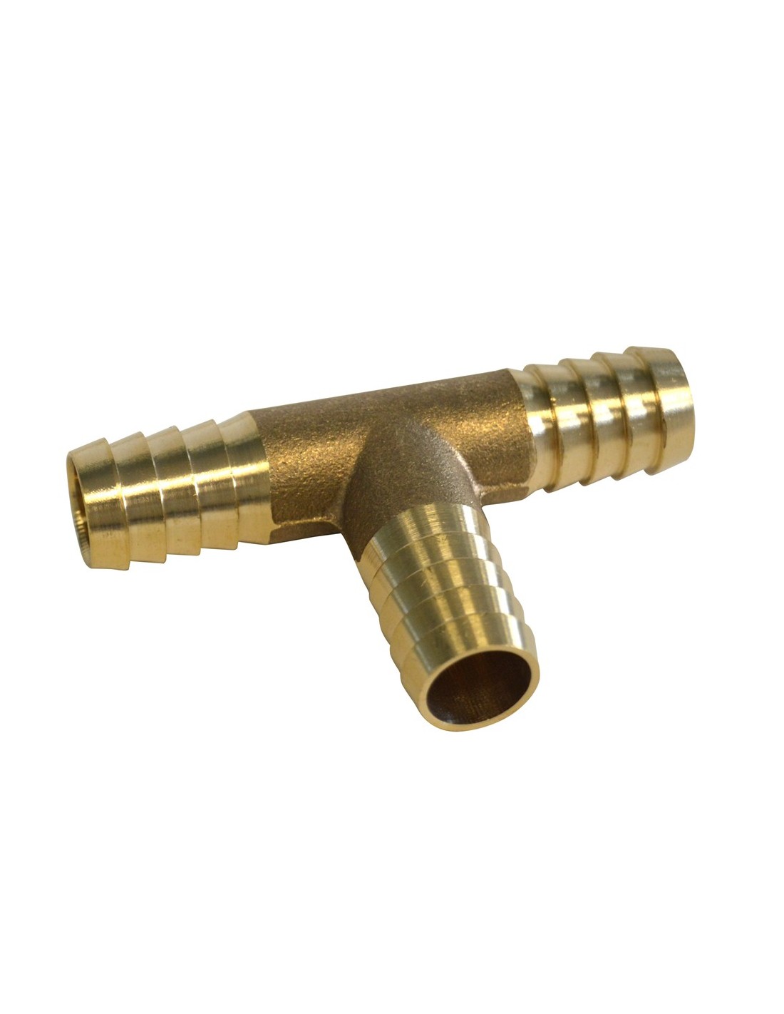 Te estriada de latón para mangueras con tres abrazaderas incluidas, que facilita la conexión en ángulo recto entre tres mangueras de 20 mm, proporcionando una distribución eficiente del agua