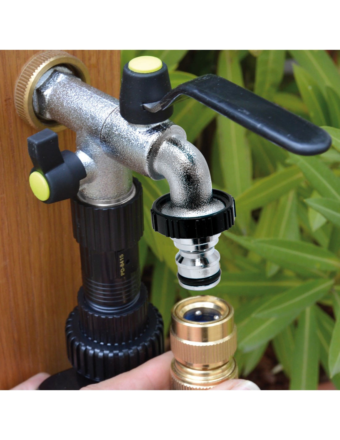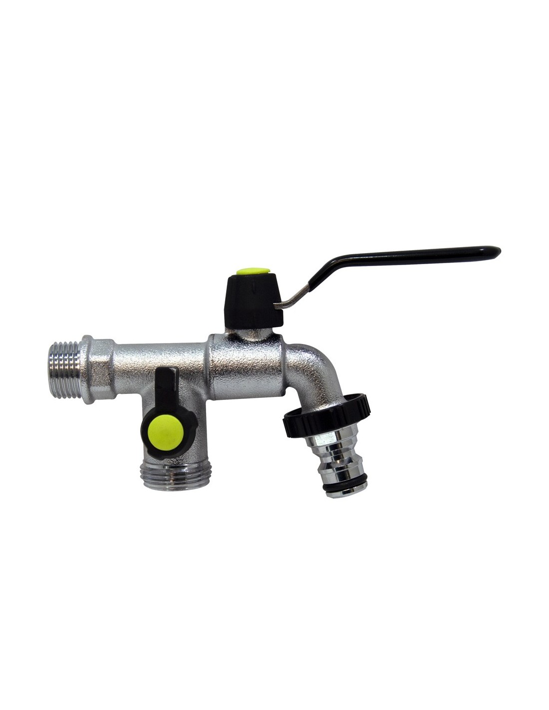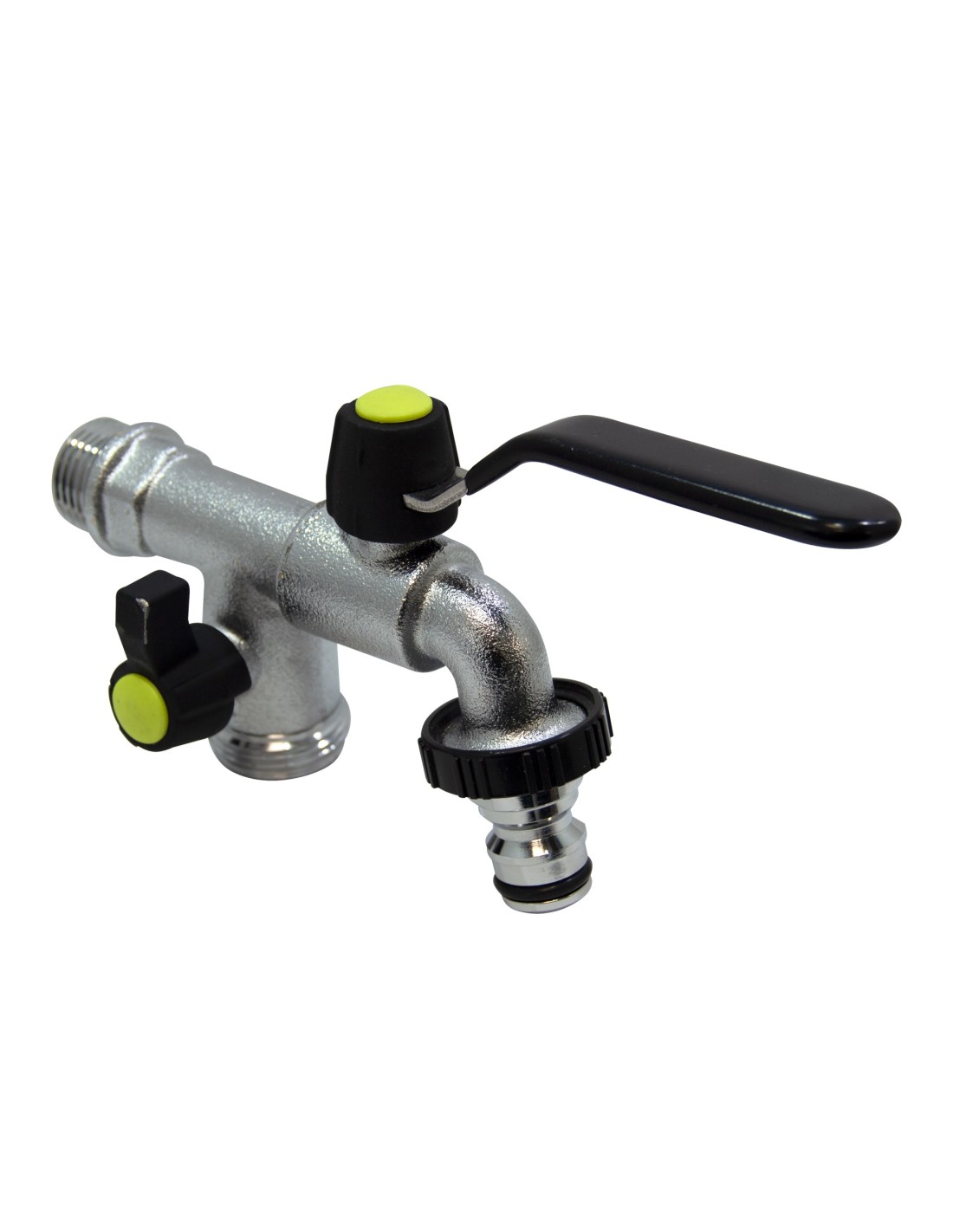 Conexión principal con toma hembra 1/2'' y dos salidas: una macho 3/4'' y un conector automático al final, que permiten conectar el mismo grifo a varias soluciones: 2 mangueras, una manguera y un programador de riego, etc.