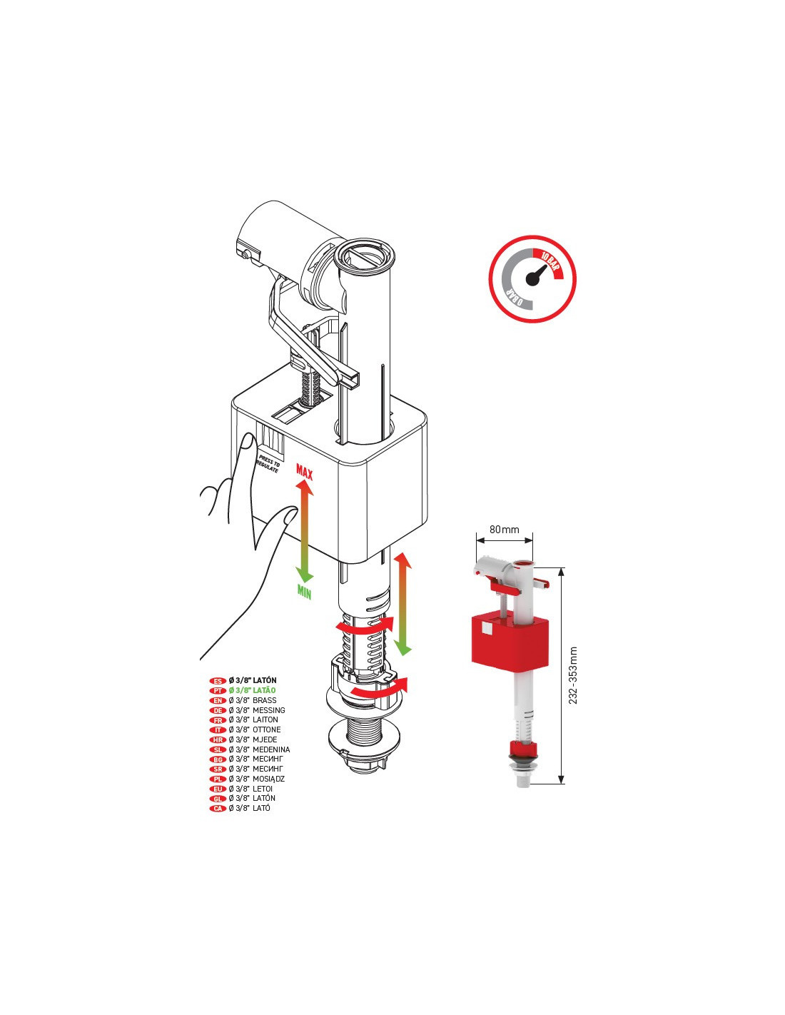 Grifo silencioso equipado con alimentación inferior y rosca de resina de tres octavos de pulgada (3/8'') de diámetro. Válido para cisternas con entrada de agua inferior.