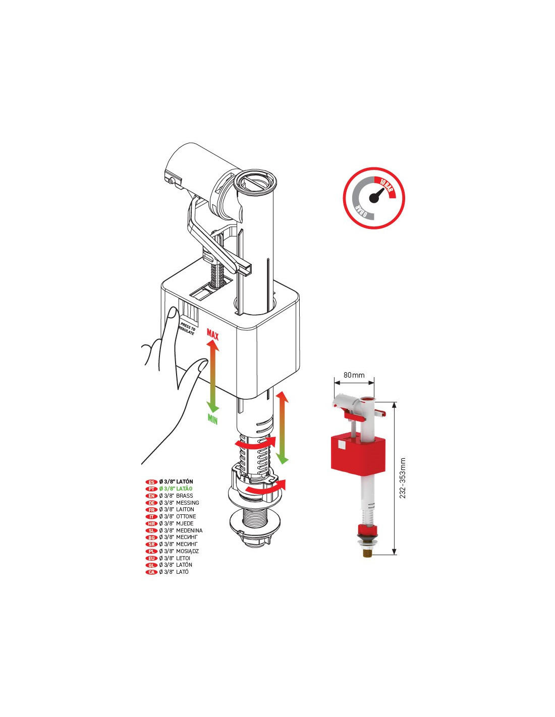 Grifo silencioso equipado con alimentación inferior y rosca de latón de tres octavos de pulgada (3/8'') de diámetro. Válido para cisternas con entrada de agua inferior. Equipado con un sistema de cierre progresivo por pistón, asegura un llenado suave y sin golpes de ariete, lo que prolonga la vida útil del sistema y reduce el ruido durante el uso. Incorpora un sistema anti retorno para evitar el flujo inverso no deseado, asegurando la seguridad del suministro de agua. Permite una instalación rápida y sencilla en diversos tipos de cisternas. Fabricado con materiales de primera calidad, entre ellos latón, este grifo es resistente a las aguas más duras, asegurando una larga vida útil y un rendimiento óptimo incluso en entornos exigentes.