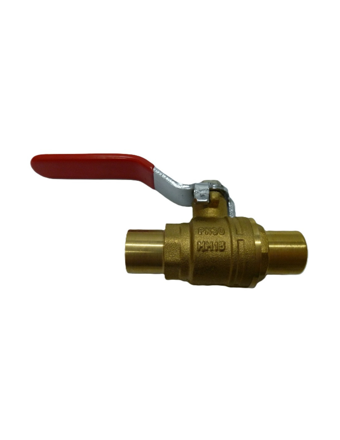 Válvula de esfera con conexión para soldar con tuberías de cobre de diámetro de 15 mm, equipada con una palanca de acero cromado en color rojo.