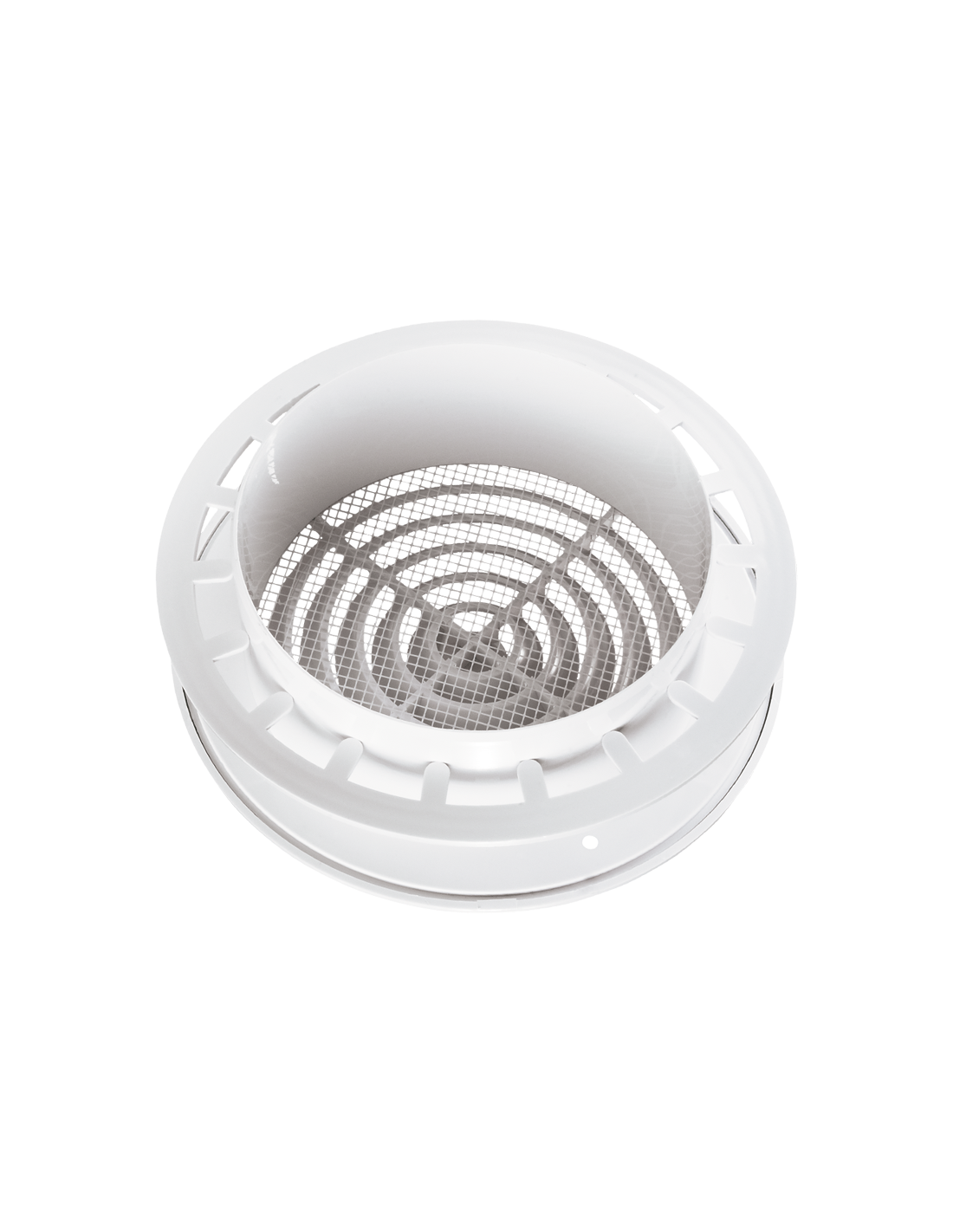 Rejilla redonda de plástico ABS blanco para empotrar directamente a tubo, con mosquitera incluida que garantiza una protección total contra insectos.